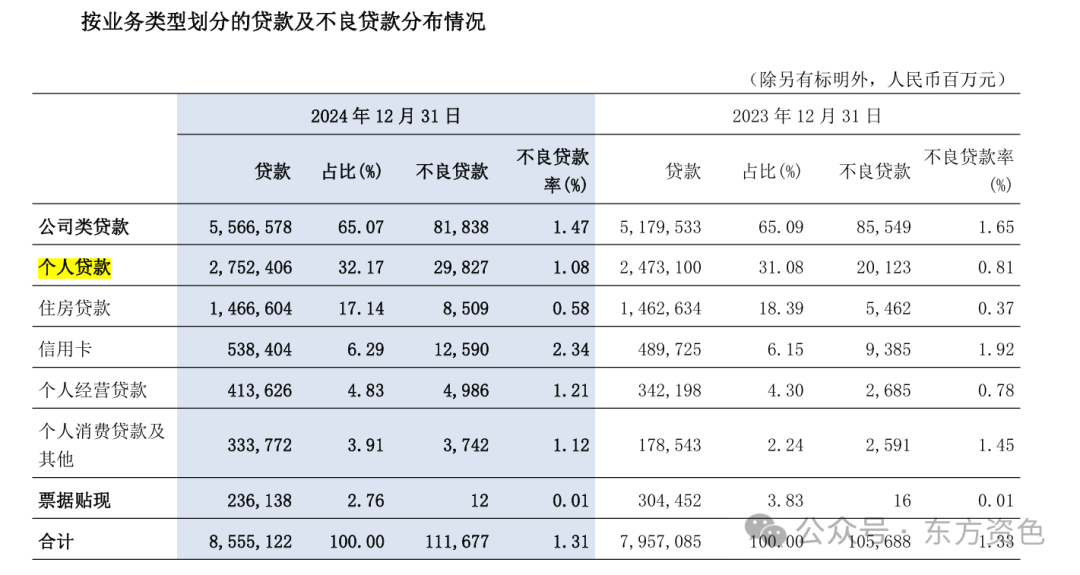 而个人贷款不良贷款率则较2023年末增长了0.27个百分点,上升至1.08%。其中,尤其是信用卡不良率同比增长0.42个百分点,从上一年的1.92%升至2.34%。此外,住房贷款的不良率升至0.58%;个人经营贷款不良率升至1.21%。