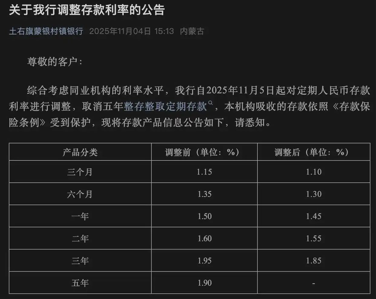 11月初内蒙古 土右旗蒙银村镇银行 发布公告称,自2025年11月5日起,取消五年期整存整取定期存款。
