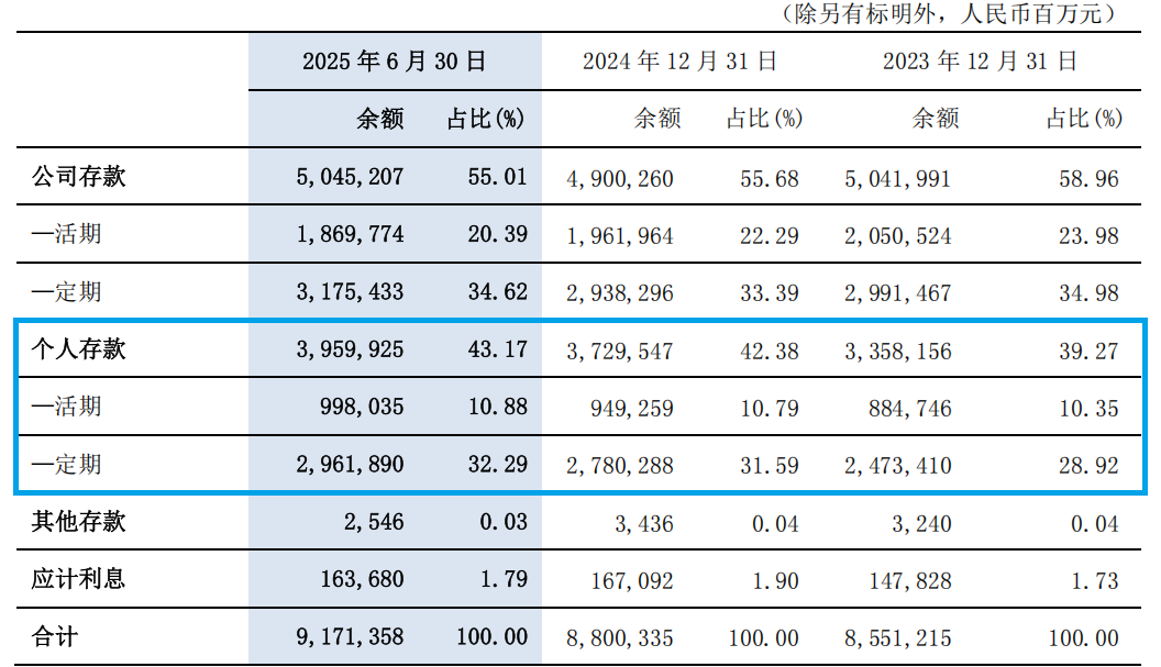 虽然三季报没有披露个人存款的具体信息,但是从交行2025年半年报的数据中可以发现,该行个人存款“定期化”的趋势更为严重。