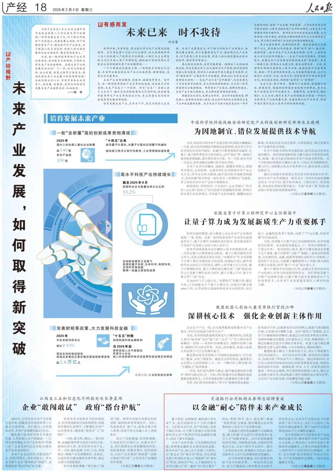 2月4日,《人民日报》刊发《未来产业发展,如何取得新突破》报道,介绍了交通银行持续深化对国家未来产业战略的金融支持,充分发挥“股贷债租托”的综合化优势,为产业发展提供全周期、一体化的综合金融解决方案,以金融“耐心”陪伴未来产业成长。