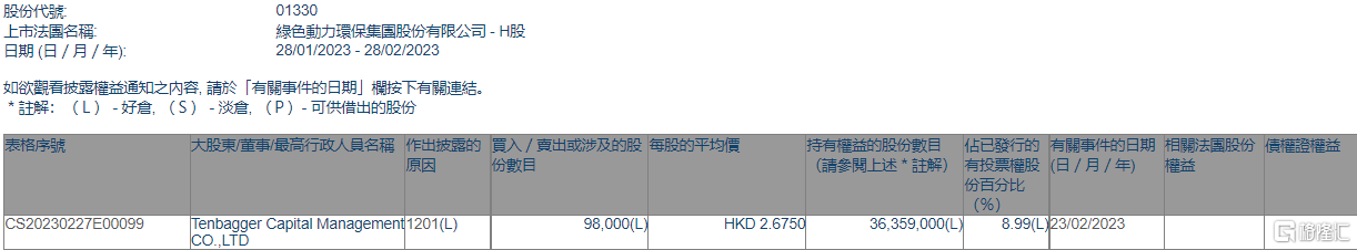 根据联交所最新权益披露资料显示,2023年2月23日,绿色动力环保(01330.HK)遭Tenbagger Capital Management CO.,LTD在场内以每股均价2.675港元减持9.8万股,涉资约26.22万港元。