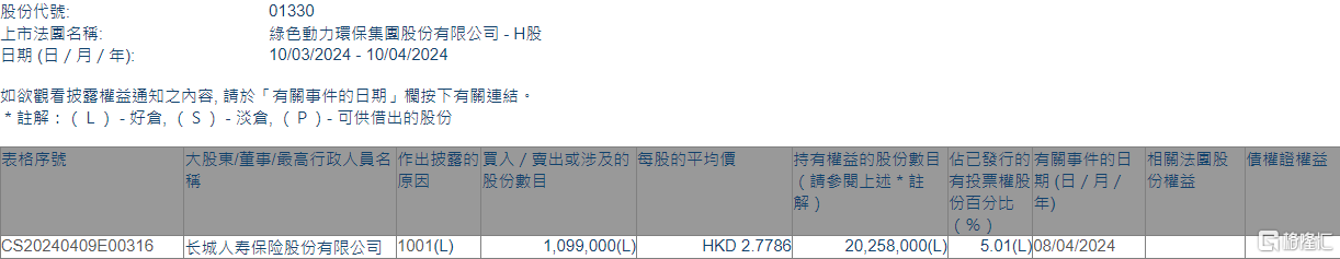 格隆汇4月10日丨根据联交所最新权益披露资料显示,2024年4月8日,绿色动力环保(01330.HK)获长城人寿保险股份有限公司在场内以每股均价2.7786港元增持109.9万股,涉资约305.37万港元。