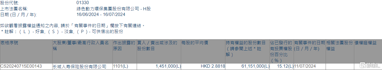 格隆汇7月16日丨根据联交所最新权益披露资料显示,2024年7月11日,绿色动力环保(01330.HK)获长城人寿保险股份有限公司在场内以每股均价2.8818港元增持145.1万股,涉资约418.15万港元。