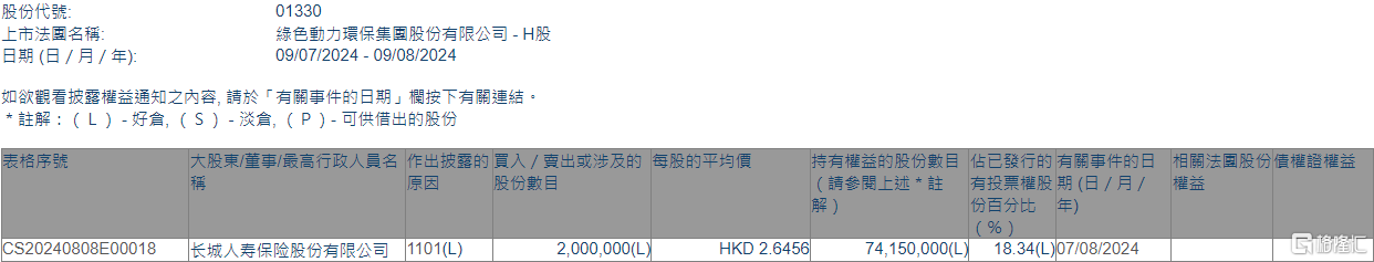 格隆汇8月9日丨根据联交所最新权益披露资料显示,2024年8月7日,绿色动力环保(01330.HK)获长城人寿保险股份有限公司在场内以每股均价2.6456港元增持200万股,涉资约529.12万港元。