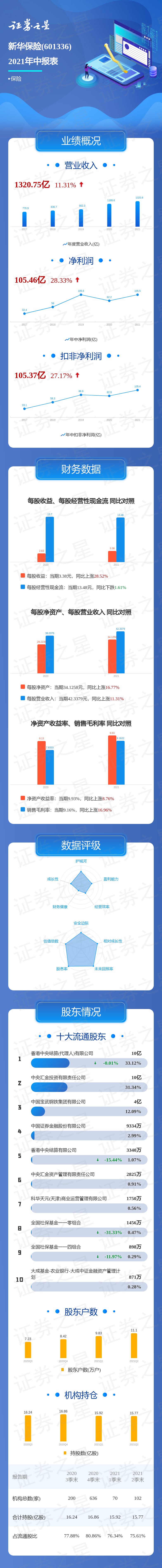 证券之星数据中心讯,新华保险2021中报显示,公司主营收入1320.75亿元,同比上升11.31%;归母净利润105.46亿元,同比上升28.33%;扣非净利润105.37亿元,同比上升27.17%;负债率89.58%,投资收益326.04亿元。