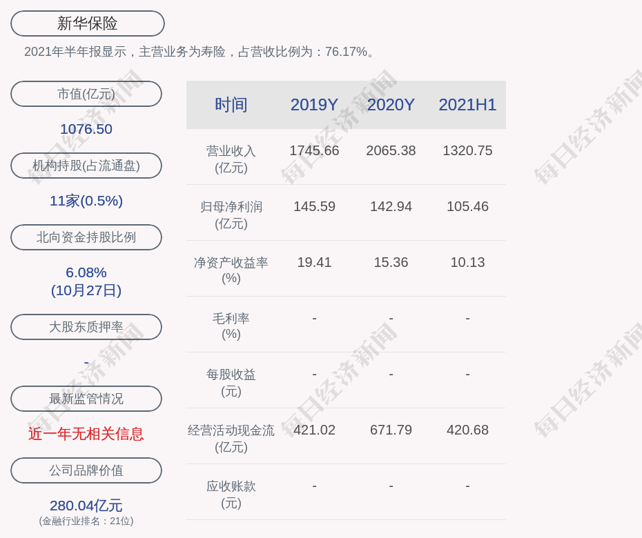2021年半年报显示,新华保险的主营业务为寿险,占营收比例为:76.17%。