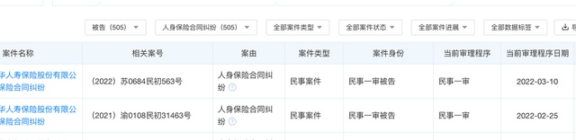 相关信息显示,在新华保险涉及的司法诉讼中,关于人身保险合同纠纷的就有580起案件,新华人寿保险作为被告的案件就有505件。