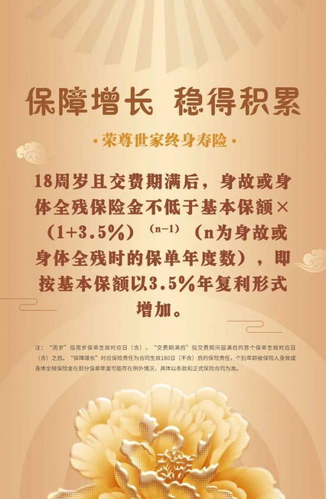 “荣尊世家”是一款保障增长、覆盖终身的保险产品,集人身风险保障、终身资产规划于一体,可满足客户人身风险管理、资产配置、定向传承等需求。