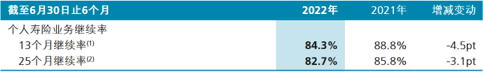 2022年上半年,该公司个人寿险业务13个月继续率为84.3%,同比下降4.5个百分点;25个月继续率为82.7%,同比下降3.1个百分点。2022年1-6月退保率为1.0%,与去年同期持平。