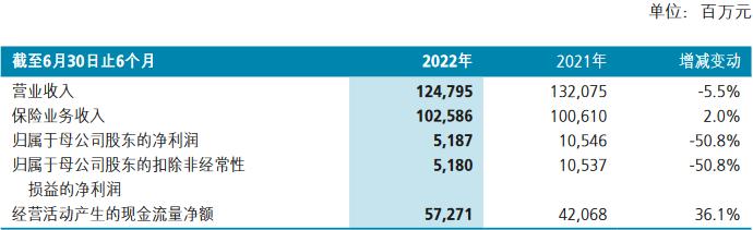 昨日晚间,新华保险(601336.SH)披露2022年半年度报告。报告期内,新华保险实现营业收入1247.95亿元,同比下降5.5%;实现保险业务收入1025.86亿元,同比增长2.0%;实现归属于母公司股东的净利润51.87亿元,同比下降50.8%;经营活动产生的现金流量净额为572.71亿元,同比增长36.1%。