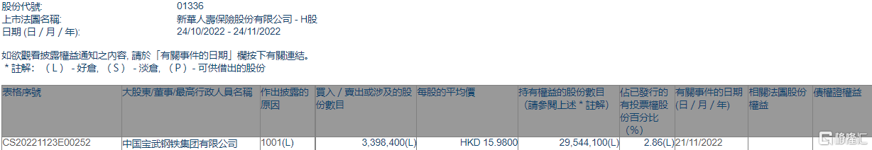 根据联交所最新权益披露资料显示,2022年11月21日,新华保险(01336.HK)获中国宝武钢铁集团有限公司在场内以每股均价15.98港元增持339.84万股,涉资约5430.64万港元。