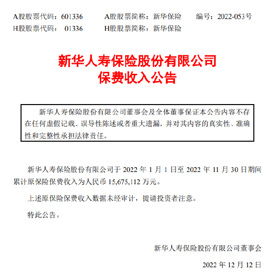 12月12日消息,新华保险今日晚间发布公告。前11个月,公司实现累计原保险保费收入为人民币1567.51亿元。