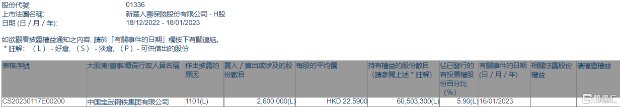 根据联交所最新权益披露资料显示,2023年1月16日,新华保险(01336.HK)获中国宝武钢铁集团有限公司在场内以每股均价22.59港元增持260万股,涉资约5873.4万港元。