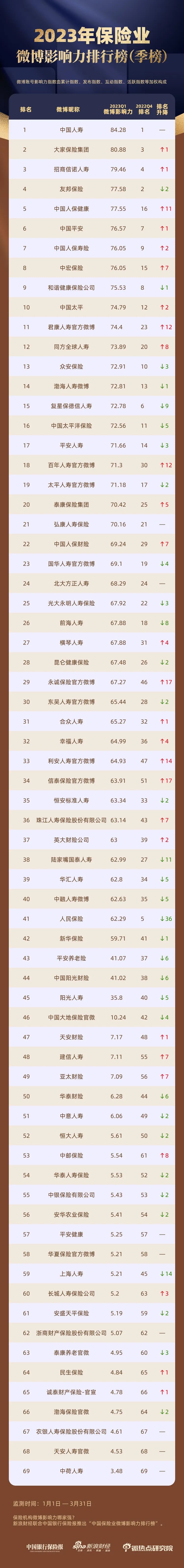 本次“中国保险业微博影响力排行榜”采用季榜的形式发布,之后我们还将推出年度榜,榜单将同步在新浪财经官网/官方微博、新浪金融研究院微信公众号。