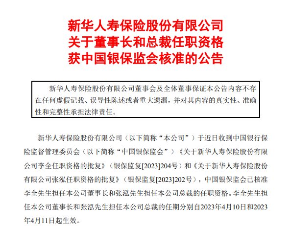 4月13日,新华保险发布公告称,已收到银保监会批复,核准李全担任新华保险董事长、张泓担任新华保险总裁的任职资格,任期分别自2023年4月10日、11日起生效。