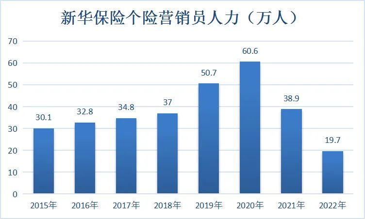 截至2022年末,新华保险个险营销员人力19.7万人,较2021年末减少19.2万人,同比下滑49.4%;月均合格人力4.5万人,同比减少50.5%;月均合格率15%,同比下降4.1个百分点。