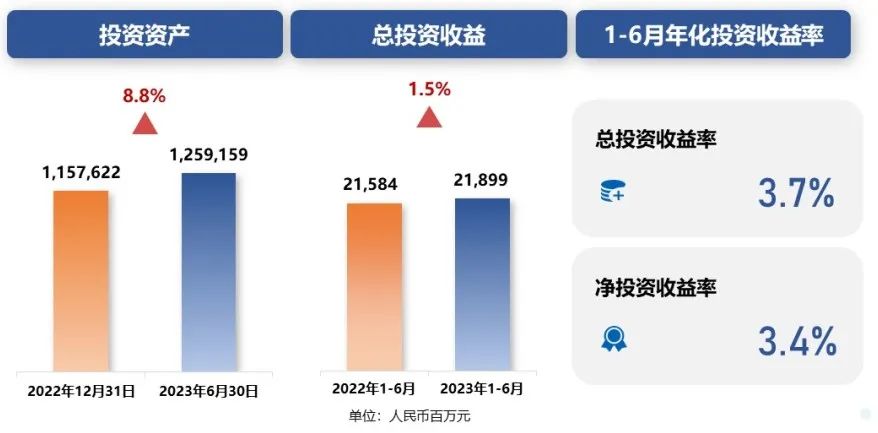 2023年上半年,公司年化总投资收益率为3.7%,实现总投资收益219亿元,同比增长1.5%。