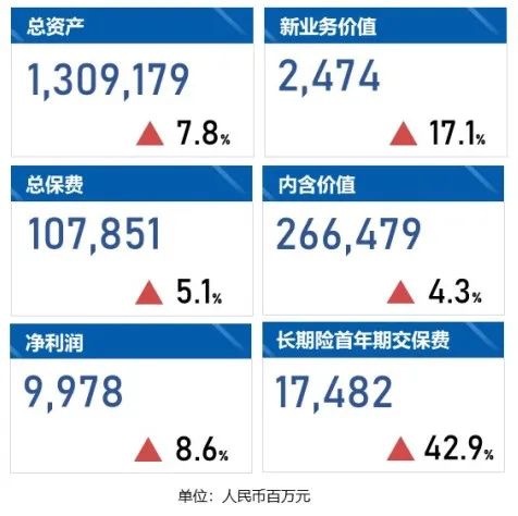 报告期内,公司实现原保险保费收入1,078.5亿元,同比增长5.1%;归属于母公司股东的净利润99.8亿元,同比增长8.6%;内含价值约2,664.8亿元,较上年末增长4.3%;新业务价值24.7亿元,同比增长17.1%;总资产1.3万亿元,较上年末增长7.8%,整体实现稳中有进。公司核心偿付能力充足率146.91%,综合偿付能力充足率239.02%,均保持行业较高水平。