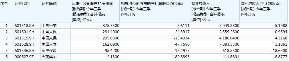 中国人保营收4186.64亿元,同比增4.32%;中国太保营收2559.26亿元,同比增0.96%;天茂集团营收411.88亿元,同比增8.88%。