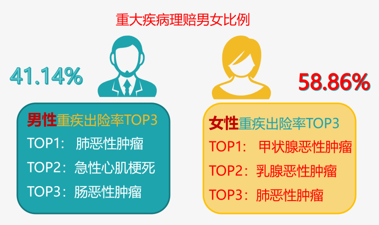 恶性肿瘤理赔中甲状腺恶性肿瘤险赔付占比最高,排名二、三位的分别是肺恶性肿瘤、乳腺恶性肿瘤。重疾险可以解决就诊治疗和康复休养费用,弥补收入损失,防止因病致贫、返贫,建议每个客户投保时重疾保障要足额设计。