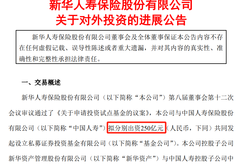 1月26日,新华保险披露了关于对外投资的进展公告。新华保险与中国人寿保险股份有限公司拟分别出资250亿元共同发起设立私募证券投资基金有限公司。同时,新华保险控股子公司新华资产管理股份有限公司与中国人寿控股子公司中国人寿资产管理有限公司分别出资500万元共同发起设立基金管理人公司,担任上述基金公司的管理人。