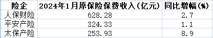 相较寿险业务,上市险企的财产险业务表现良好。2024年1月,人保财险、平安产险和太保产险分别实现保费收入628.28亿元、324.33亿元和253.93亿元,同比分别增长2.7%、1.1%和8.9%。