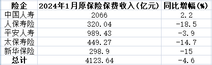 A股五大上市险企近日相继披露2024年首月保费收入(指原保险保费,下同),中国人寿、中国人保、中国平安、中国太保和新华保险共揽保费5505.96亿元,同比下降2.6%。