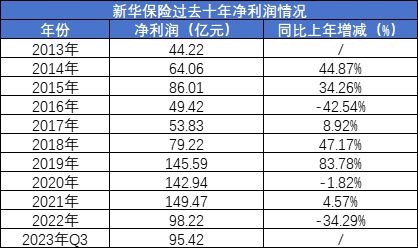 但正如经济有周期波动,权益市场自然也是如此。2022年开始,权益市场出现大幅度下跌,新华保险利润也出现快速回落。2022年全年利润为98.22亿元,同比大降34.28%。2023年前三季度,新华保险净利润为95.42亿元,同比下降15.5%。由于去年四季度国内权益市场继续大幅度下跌,我们预期新华保险2023年全年利润大概率同比会继续下滑。