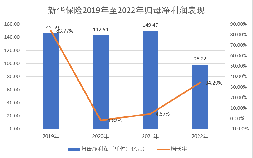 拉长时间来看,新华保险近年来的盈利表现也难称合格。该公司归母净利润在于2019年增长83.8%至145.59亿元后,连续两年维持在140亿元以上。但自2022年起,新华保险的归母净利润下降34.3%至98.22亿元,开始出现断崖式下跌。