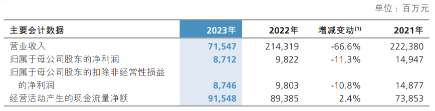 财报显示,新华保险2023年的营业收入为715.47亿元,较2022年同期的2142.19亿元收窄过半,降幅达到66.6%。归母净利润为87.12亿元,较2022年同期的98.22亿元下降11.3%;扣非后净利润亦由2022年的98.03亿元下降10.8%至87.46亿元。