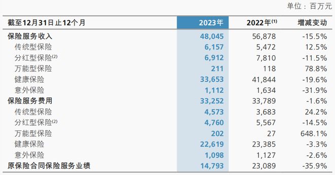 在原保险合同保险服务业绩方面,原保险合同保险服务业绩较上年同期下降35.9%,下降金额达82.96亿元,其中保险服务收入较上年同期下降15.5%,主要由于健康险保险服务收入同比减少;保险服务费用较上年同期下降1.6%。