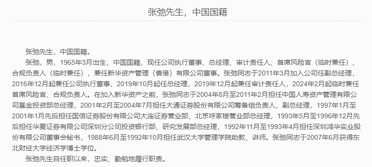 有消息称,张驰在内部已经被免职。不过新华资产的网站上,并未撤下其简历。