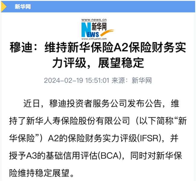 今年2月,新华保险获得穆迪和惠誉两大评级机构的高度认可,分别维持其A2和A的保险财务实力评级,并保持稳定展望。穆迪投资者服务公司维持了新华保险A2的保险财务实力评级(IFSR),并授予A3的基础信用评估(BCA),并指出,作为中国最知名的人寿保险公司之一,新华保险资本充足,偿付能力充足率在同业处于最高水平之一。全球知名评级机构——惠誉国际信用评级有限公司发布报告称,已确认新华保险的保险公司财务实力评级(IFS)为“A”(强劲),展望稳定。惠誉预期,新华保险将保持充裕盈余,为保费增长和偿付能力稳定性提供支撑。