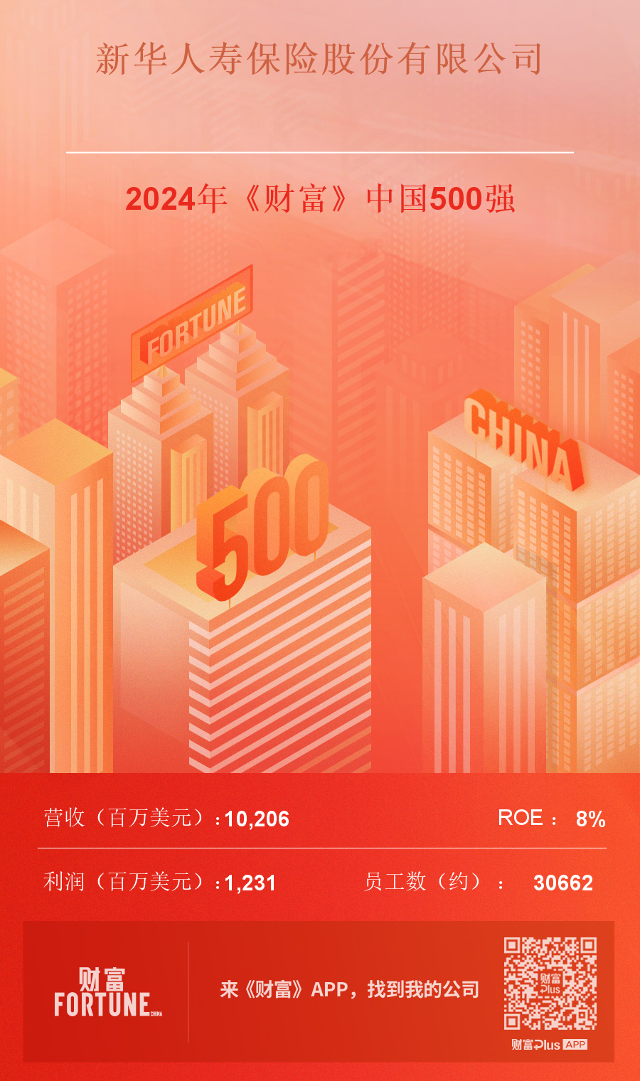 7月25日,2024年《财富》中国500强排行榜揭晓,新华保险连续13年入榜《财富》中国500强。作为中国目前率先采用新会计准则(IFRS17)的寿险公司,榜单期内显示,新华保险2023年营业收入约为102亿美元,排名第262位。