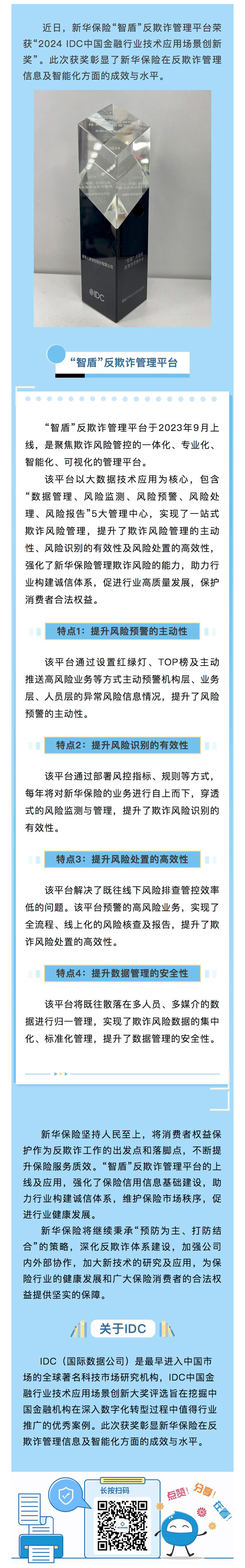 新华保险“智盾”反欺诈管理平台荣获“2024 IDC中国金融行业技术应用场景创新奖”