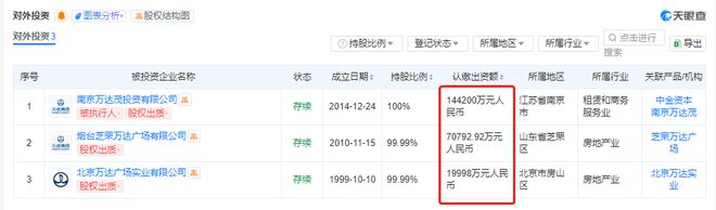 北京万达广场、烟台万达广场、南京万达茂的认缴出资额分别为:2亿、7.08亿以及14.42亿。