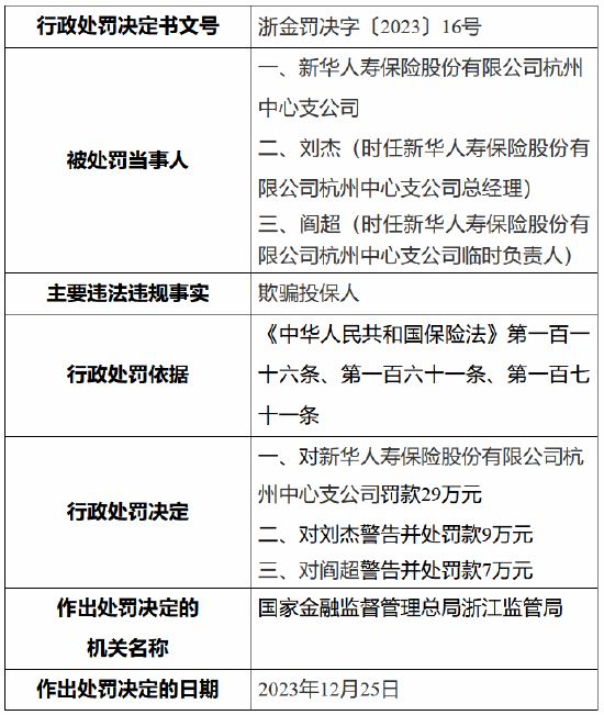 比方说去年12月,新华人寿温州、杭州、上海分支公司,就因欺骗投保人等违法违规事实(案由),合共被罚108万元。