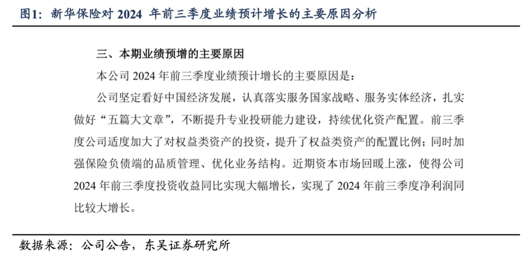 事件:10月8日,新华保险披露2024年前三季度业绩预增公告,预计9M24累计实现归母净利润为186.07亿元至205.15亿元,对应同比增长95%至115%;预增中枢对应3Q24归母净利润为84.78亿元,而上年同期3Q23单季归母净利润-4.36亿元,大幅扭亏为盈。业绩表现超出预期,预告时间点更超预期,彰显新一届管理层底部权益加仓信心,同时也稳定了投资者预期,我们继续维持自9月末将新华保险作为板块首推。