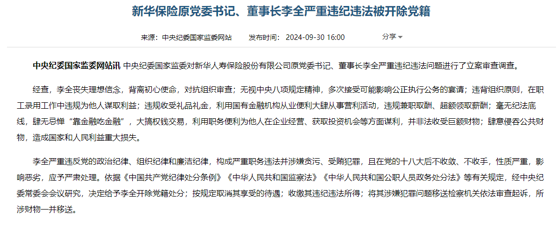 今年4月,新华保险原董事长被查,根据9月30日中纪委发布的通告,李全因为涉嫌非法收受巨额财物,被开除党籍,并取消享受的待遇。
