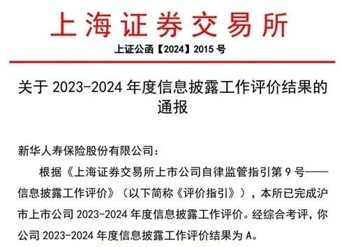 新华保险作为“A+H”上市公司,信息披露工作已连续九年获得上交所最高等级“A”级评价。新华保险通过专业、合规、高质量的信息披露工作向市场传递公司信息,树立公司在资本市场规范良好的形象,助力公司稳健经营和高质量发展。