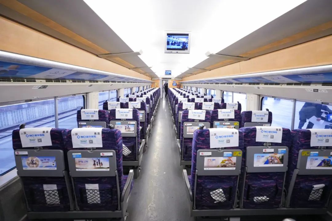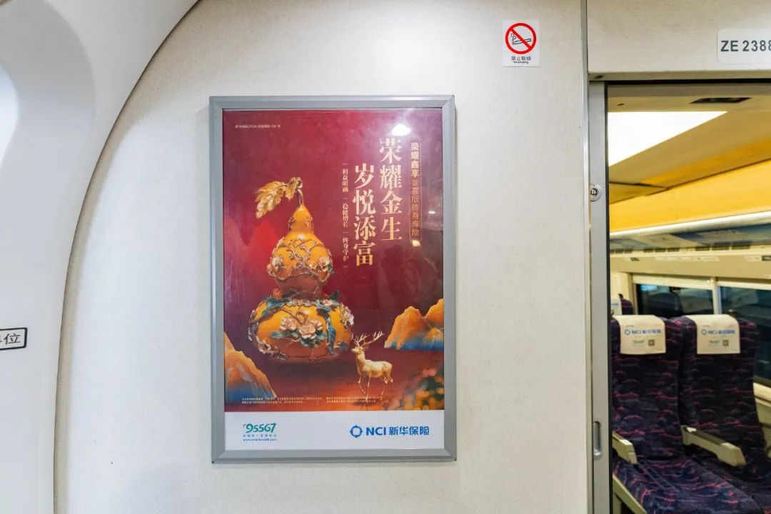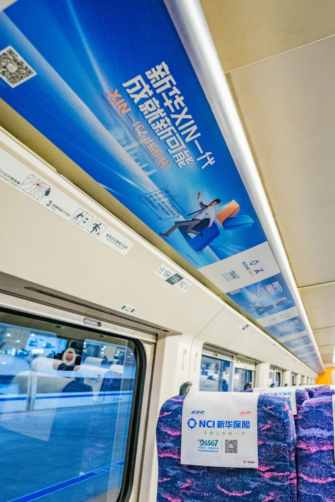 “新华保险”的品牌标识和“好产品在新华”的彩贴在列车车身格外醒目,吸引着过往行人的目光。车厢内,新华保险的品牌形象、主打产品、客户服务和专业团队等元素通过头片、桌贴、品牌天幕和海报等形式逐一展现,为乘客带来一场沉浸式的品牌体验。车厢内的语音播报以温馨的语调伴随每一位乘客,直至安全抵达旅途的终点。