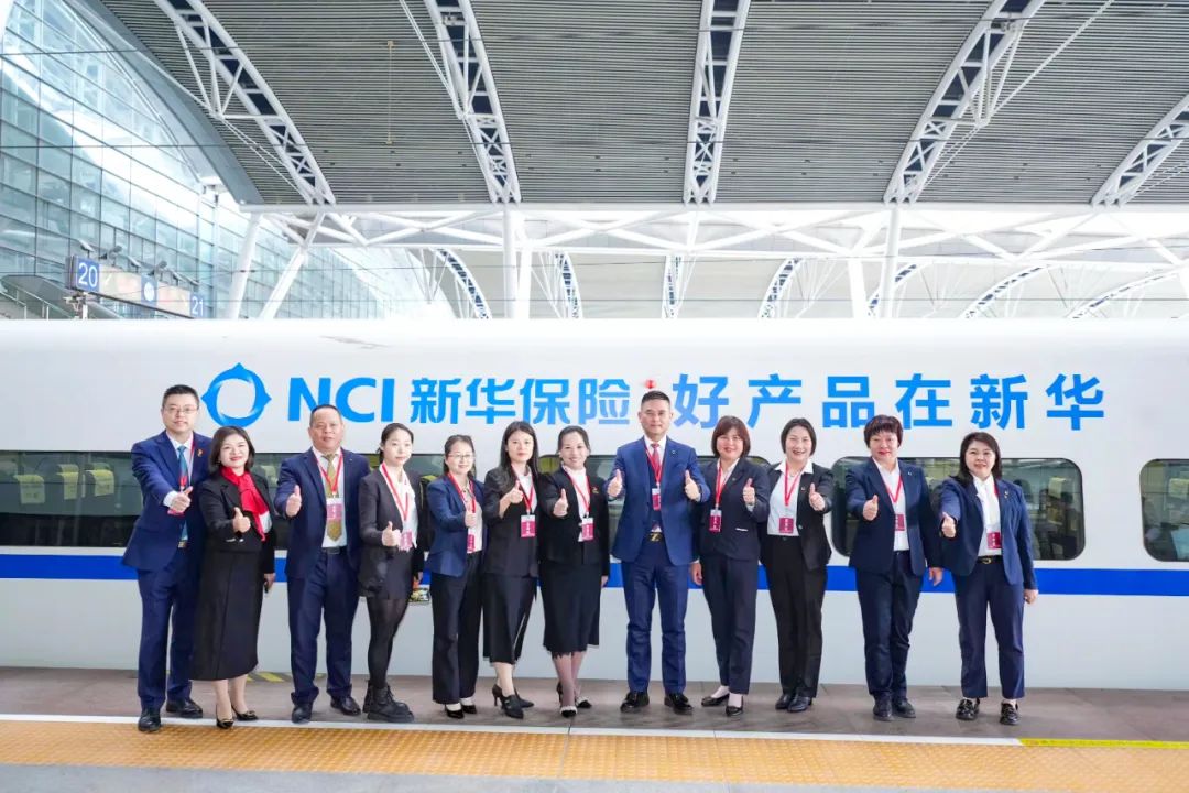 广州南站首发仪式特别邀请广东分公司绩优业务代表参加,走进新华保险品牌列车车厢打卡,并在贴有“好产品在新华”品牌名片的新华专列前合影留念。