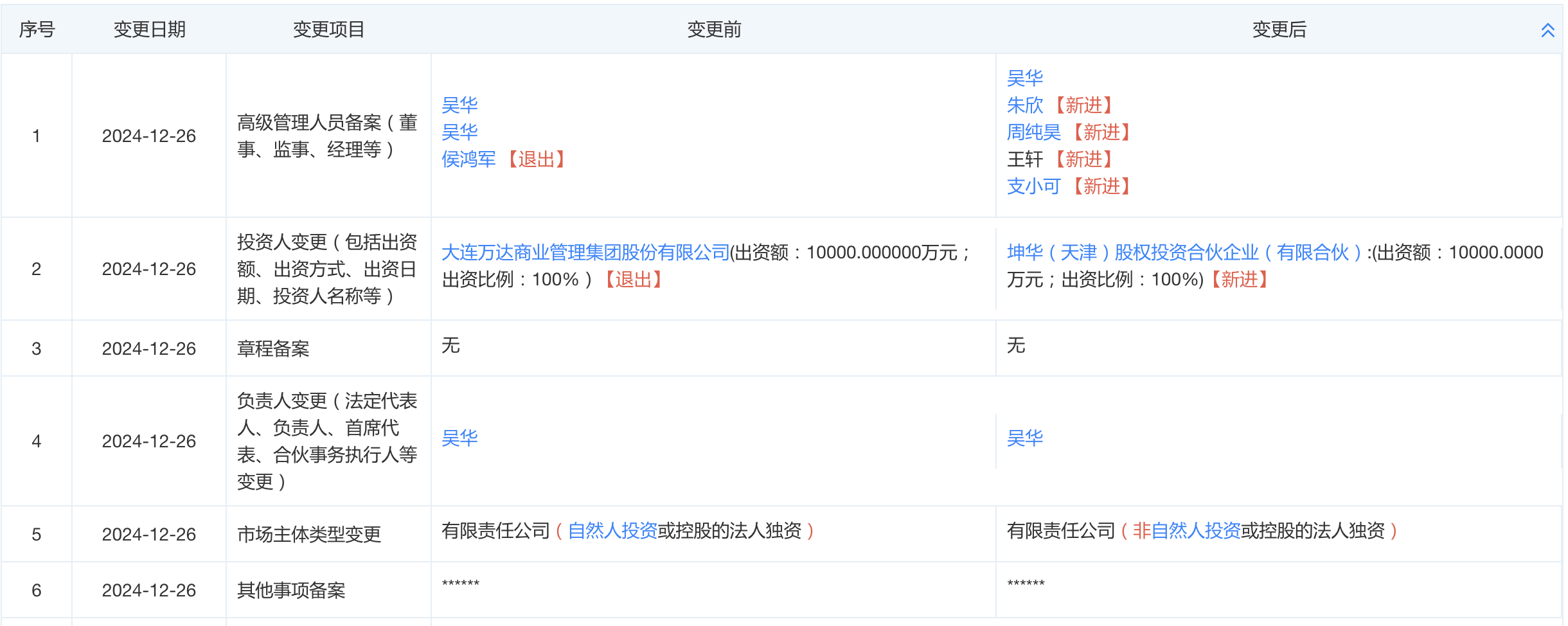 坤华(天津)股权投资合伙企业今年以来陆续接手多家万达广场,仅12月就有3家万达广场完成工商变更。