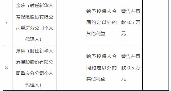 金莎(时任新华人寿保险股份有限公司重庆分公司个人代理人)、张涛(时任新华人寿保险股份有限公司重庆分公司个人代理人)存在以下违法违规事实:给予投保人合同约定以外的其他利益。重庆金融监管局决定分别对其处以罚款0.5万元。