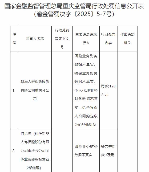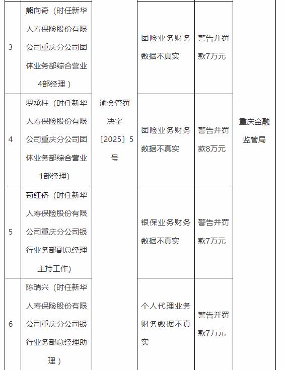 付长纮(时任新华人寿保险股份有限公司重庆分公司团体业务部综合营业2部经理)、熊向奇(时任新华人寿保险股份有限公司重庆分公司团体业务部综合营业4部经理)、罗承柱(时任新华人寿保险股份有限公司重庆分公司团体业务部综合营业1部经理)存在以下违法违规事实:团险业务财务数据不真实。重庆金融监管局决定分别对其处以罚款9万元、7万元、8万元。
