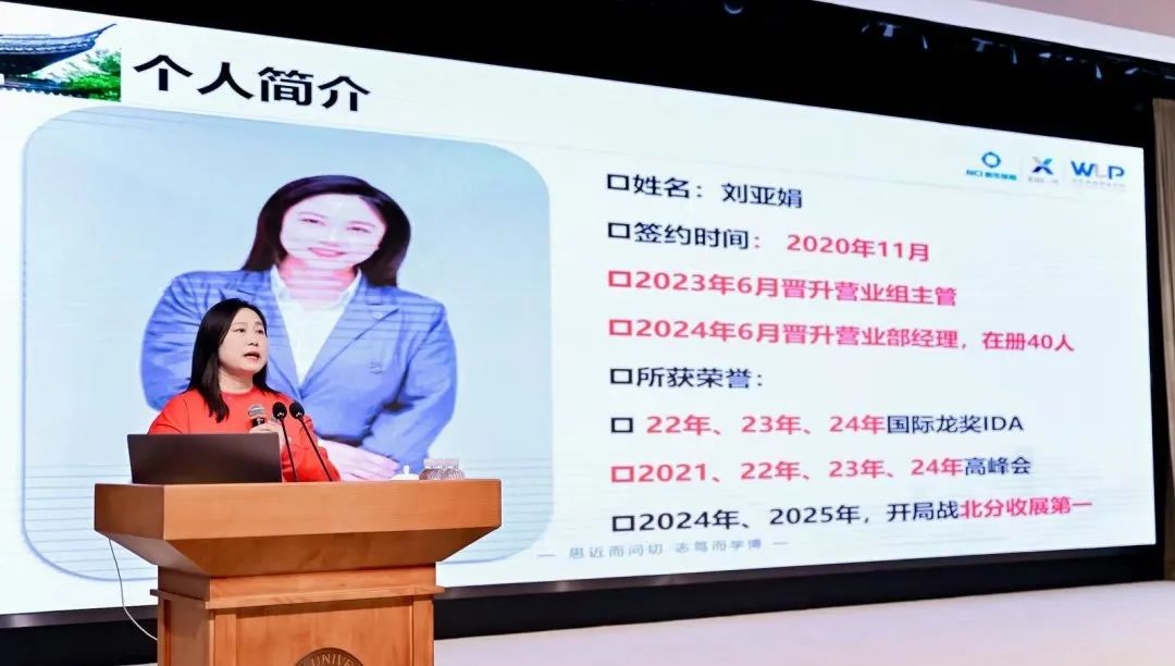 北京分公司刘亚娟带来分享,通过树立个人品牌,借助三问定位法明确优势,实现转介绍和老客户加保。在经营深耕方面,以客户服务5个100%为准则,采用客户经营四步法,运用场景赋能等经营艺术,通过多种活动开拓客户。