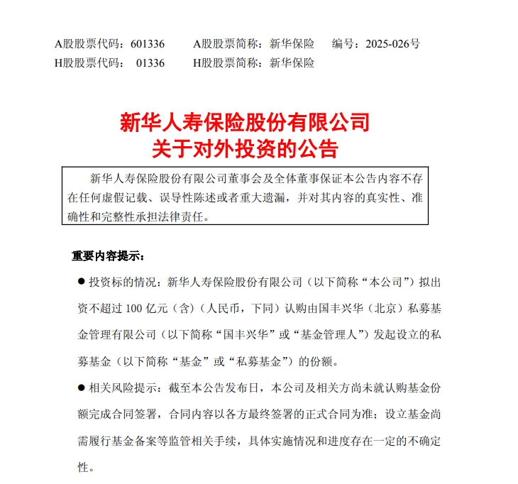 2025年1月,金融监管总局批准第二批保险资金长期投资试点,额度为520亿元。3月,金融监管总局又批复了人保寿险、中国人寿、太平人寿、新华人寿、平安人寿等5家保险公司开展长期投资试点,规模为600亿元。共8家保险公司获得金融监管总局批准以契约制基金方式参与试点,规模从500亿元扩展至1620亿元。其中,中国人寿与新华保险继续设立鸿鹄基金二期,获批规模200亿元。而这两200亿元就是今晚新华资产的公告内容。