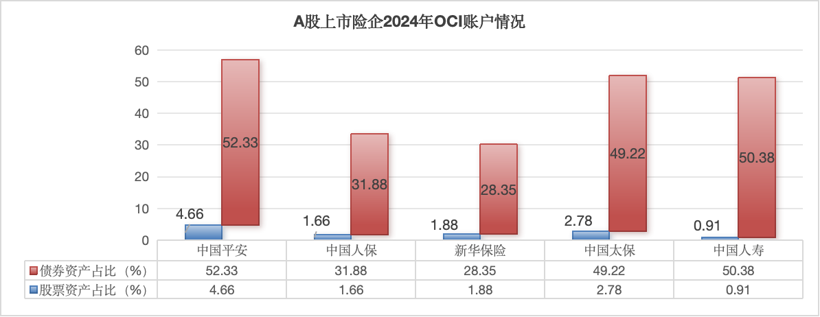 信风注意到,新华保险计入OCI账户的股票、债券资产比例均小于同业;