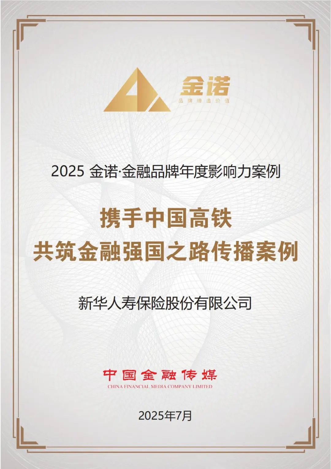 7月8日,中国金融传媒公布了2025金诺·金融品牌影响力案例名单,新华保险《携手中国高铁共筑金融强国之路传播案例》获评年度影响力案例。