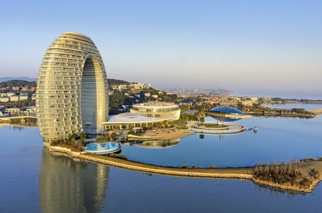 湖州喜来登温泉度假酒店(月亮酒店),呈弧形横跨湖面之上,高101.2米,是湖州的标志性景观。